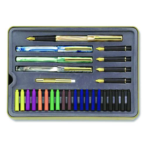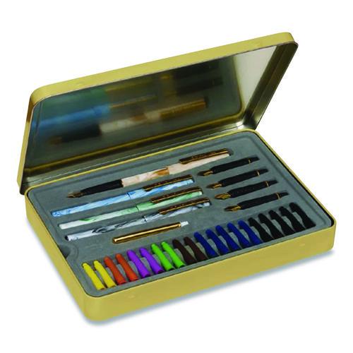 Master the Art of Calligraphy with Staedtler®. This comprehensive set contains everything you need to learn and develop your copperplate calligraphy skills and Spencerian penmanship. In addition to the pens, this versatile set includes a fountain-pen instructions guide, a step-by-step lettering workbook with a practice pad for honing your skills, a full set of interchangeable fountain-pen nibs, a liquid-ink pump and an assortment of liquid-ink cartridges in a range of colors. Delivering enhanced ergonomics, its included nibs also feature rubberized grips for writing comfort. A sturdy and attractive metal case keeps the whole set together, ensuring easy storage and convenient portability.