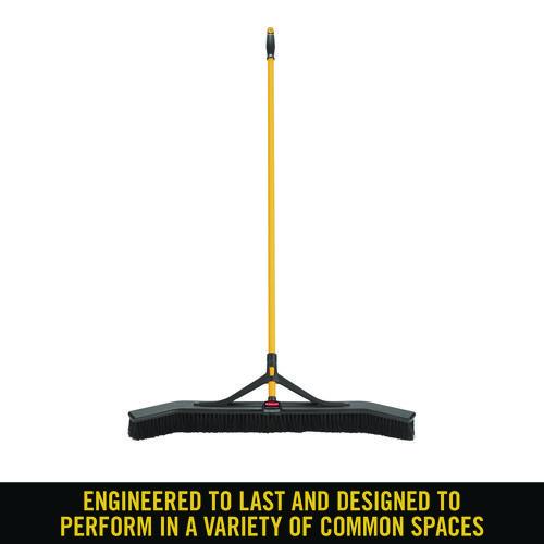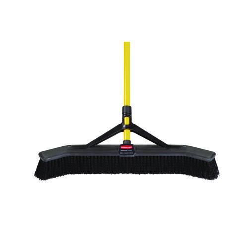 Angled sides capture more debris per stroke than standard push brooms. Polypropylene foam block resists cracking, splitting, warping and rotting. Bristle broom has a lightweight steel handle with supporting yoke, holds up to repeated use. Molded comfort handle grip reduces strain.