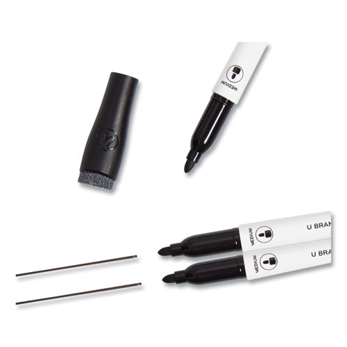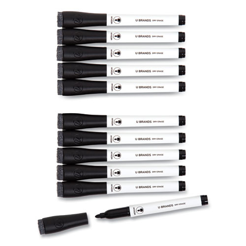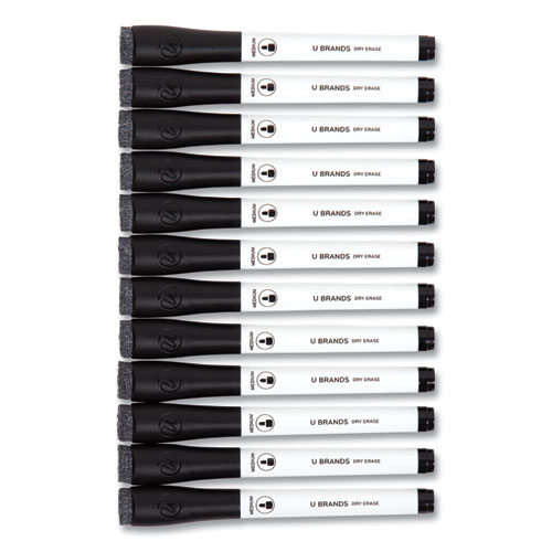U Brands medium point dry erase markers feature bold and vibrant color inks that dry quickly, erase easily and work great on any dry erase board surface. The markers also feature long-lasting, non-toxic, low odor ink that is great in any classroom, home, office or commercial environment. The dry erase markers feature a medium tip for a precise writing experience on any melamine, painted steel, porcelain or glass dry erase surface. The contoured marker cap design prevents the markers from rolling off any flat surface or tray. The built-in felt eraser into the marker cap enables quick, convenient and precise erasing. For best results, re-cap the marker immediately after use and store horizontally.
