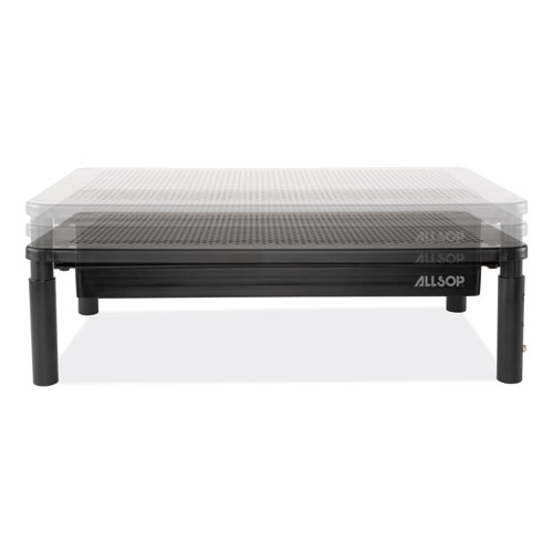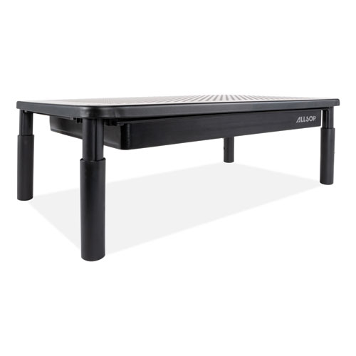 The Allsop Metal Art Tri-Level monitor stand features a durable powder-coated metal platform with micro-dot perforated holes and supports monitors up to 30 lbs and 27 inches. The telescoping legs allow users to choose from three height levels (4.13 inches, 5 inches, or 5.75 inches) for ideal ergonomic comfort. The integrated storage drawer is the perfect place for extra supplies and has a phone slot for easy access.