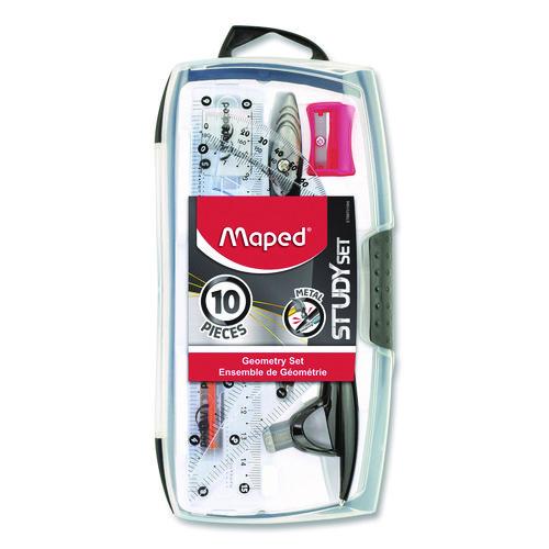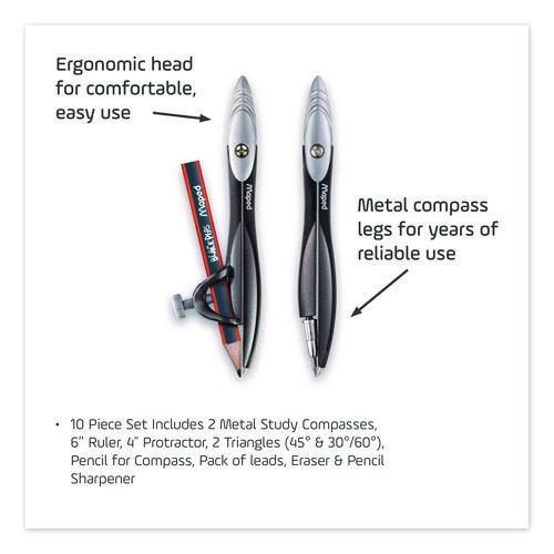 This 10-Piece Geometry Set is perfect for geometry, drawing and measuring because it comes with everything you need to get the job done. Durable metal compasses are ergonomically designed and work with compass leads or any standard pencil or thin pen. 6″ ruler, triangles and protractor are all made of crystal-clear material so you can easily see what you are measuring. Set comes packed in a reusable storage case and includes two metal study compasses, 6″ ruler, 4″ protractor, two triangles (45° and 30°/60°), pencil for compass, pack of leads, eraser and pencil sharpener.