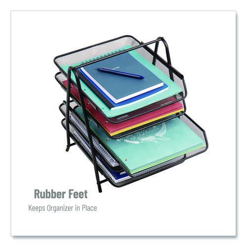 Multi-tiered design provides ample storage capacity for storing and organizing a variety of items such as files, mail, documents, folders, bills and letters. Declutter your desk or counter and keep everything within easy reach. The attached rubber feet ensure that the organizer stays in place. Access your items with confidence, knowing that the organizer won’t slip or move around on your desk. The rubber feet also help protect your desk surface from scratches. With a convenient carrying handle, this tray organizer is easily portable. You can take it with you wherever you work, whether it’s in a college dorm, office, home, school, conference room, business, hotel or any other setting. This versatile organizer streamlines your space and keeps papers in place, making it an ideal solution for improving organization and efficiency. Accommodates standard-sized documents and provides ample storage space while remaining compact.