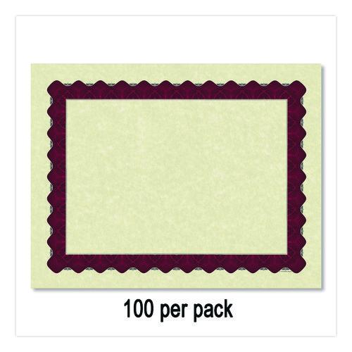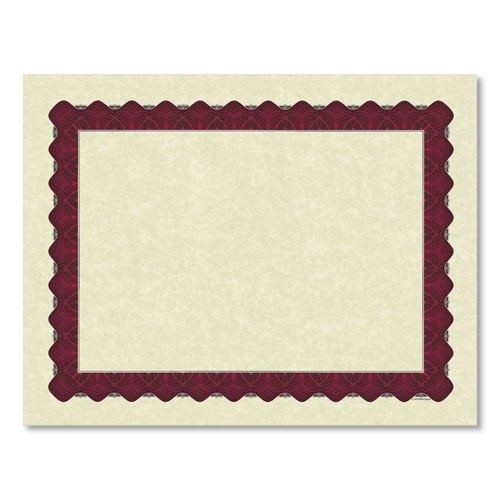 Product Details** Global Product Type Printable Certificates Shape Rectangular Color Family Beige Paper Basis Weight (lb) 60 lb Bond Color(s) Ivory/Red Border Color(s) Red Width 11″ Height 8.5″ Product Biodegradability Indicator N Product Biodegradability in Days 0 Product Compostability Indicator N Pre-Consumer Recycled Content Percent 0% Post-Consumer Recycled Content Percent 0% Total Recycled Content Percent 0% Country Of Origin CN Carton Weight 34 lbs. Carton Pack Quantity 6 PK Pack Quantity 100 EA UPC 601952341007 UNSPSC 49101705 Shipping Weight & Item Dimensions Weight 1.469 lbs. Length 11.167 in Height 0.696 in Width 8.583 in