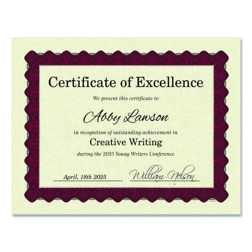Create professional documents for graduation ceremonies, awards, and contest winners by printing custom designs on these parchment-patterned certificates. Delicate metallic border calls attention to recognized achievements. Lignin- and acid-free sheets are compatible with both inkjet and laser printers. Easy-to-use printing templates on supplier’s website.