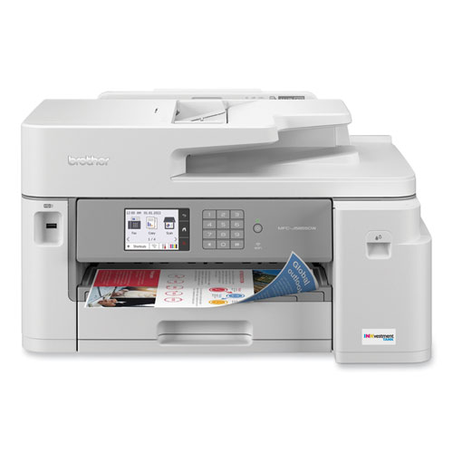 Ink Big! The Brother MFC-J5855DW INKvestment Tank color inkjet all-in-one printer comes loaded with up to one year of ink in-box. Fast print, scan, copy and fax functions let you print up to 11″ x 17″ (Ledger) size, copy, scan, and fax up to 8.5″ x 11″ (Letter) size. Vibrant, color makes your pictures pop and your text stand out, delivering professional-looking prints from work or home. Powered by Brother MAXIDRIVE Inkjet Technology, delivering Brother’s fastest INKVestment Tank printers ever. Work where and when you want with multiple connection options; advanced triple layer security to help safeguard sensitive documents while printing.