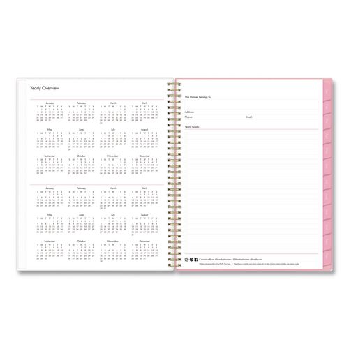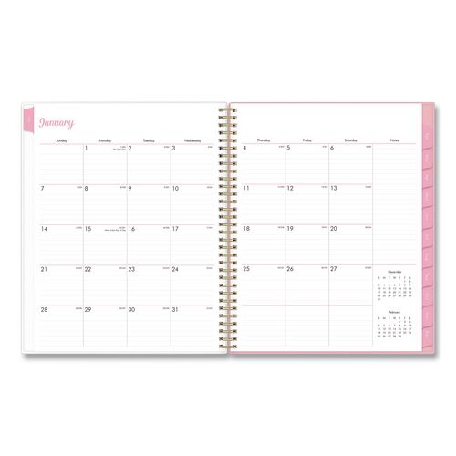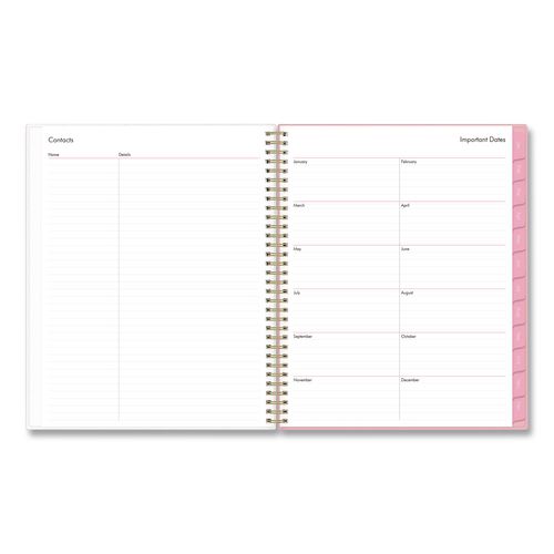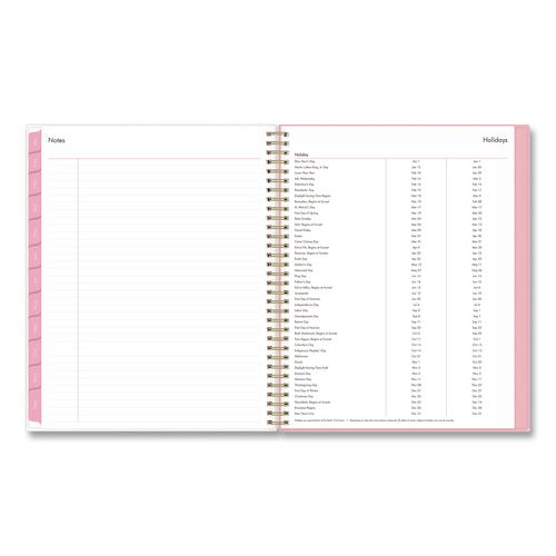 Product Details** Global Product Type Appointment Book/Personal Organizers Dated Yes Academic Year No Calendar Format Weekly/Monthly Edition Year 2026 Calendar Term 12-Month (Jan to Dec) Binding Type Wire-O Color Family Multicolor Refillable No Calendar Spread Format One Week per Two-Page Spread,One Month per Two-Page Spread Julian Dates No Size (Bound-Side First) 11 x 8.5 Cover Theme Floral Artwork Cover Color(s) Pink,Blue,Rose Cover Material(s) Polypropylene Binding Color(s) Gold Appointment Ruling Open Scheduling Calendar Reference Blocks One Past Month,One Future Month Separate Sections Contacts Page,Holiday List,Important Dates Page,Ruled Notes Pages,States & Capitals Map,Two-Year Reference Calendar,Yearly Goals Sheets per Calendar/Planner 70 Sheet Color(s) White Pocket Details (1) Interior Storage Poly Pocket Reversible No Refill Type No Seasonal Availability Yes Product Biodegradability Indicator N Product Biodegradability in Days 0 Product Compostability Indicator N Pre-Consumer Recycled Content Percent 0% Post-Consumer Recycled Content Percent 0% Total Recycled Content Percent 0% Disclaimer Statement This product was made using wood sourced from a certified managed forest. Country Of Origin CN Carton Weight 7 lbs. Carton Pack Quantity 6 EA Pack Quantity 0 UPC 699931915905 UNSPSC 44112002 Shipping Weight & Item Dimensions Weight 1.19 lbs. Length 11.14 in Height 0.63 in Width 9.29 in