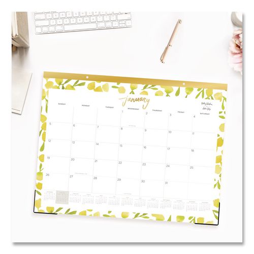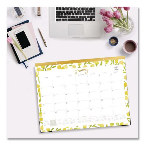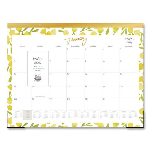 Stay focused and uplifted with this beautiful Kelly Ventura for Blue Sky® desk pad calendar! The fresh abstract lemon artwork by the Michigan artist will keep drawing you back in, making your organization dreams come true. The calendar features generously sized daily blocks for multiple entries and lists all major holidays. A reference calendar with 13 past/future months is included on each page. A sturdy backboard provides a cushioned writing surface as you plan your month out, and clear corner protectors keep pages flat. The paper is premium-quality and acid-free, minimizing potential ink bleed-through.