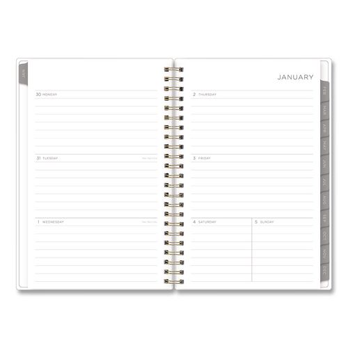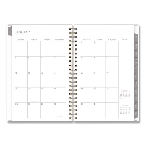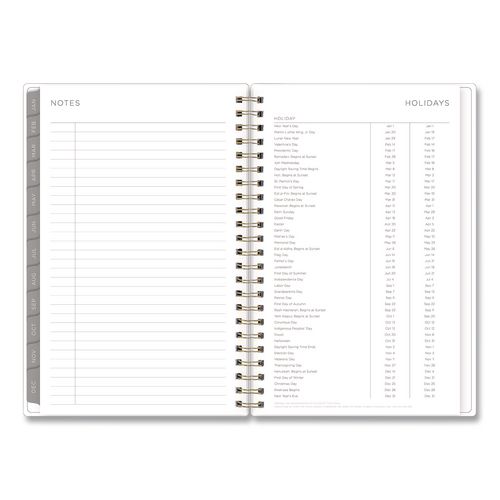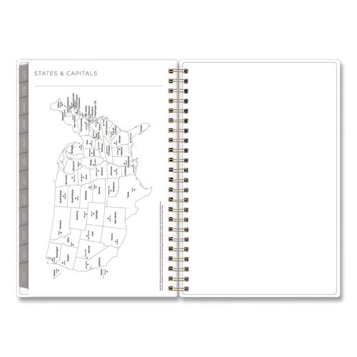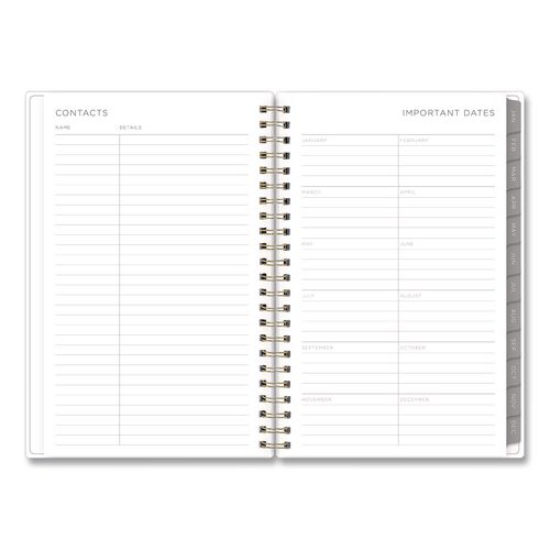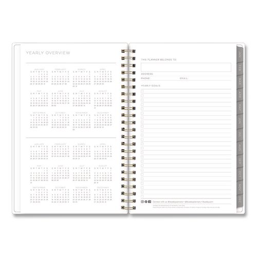 Stay focused and uplifted with this beautiful Kelly Ventura for Blue Sky® planner! The fresh abstract lemon artwork will keep drawing you back in, making your organization dreams come true. The planner’s flexible, open-format weekly spreads and tabbed monthly views provide lots of space for all your planning and scheduling needs. Six past-year, untabbed monthly spreads help you transition into the new year, while extra resources at the back of the planner help you track yearly goals, contacts, important dates and more. Durable, twin-wire binding allows the book to lie flat when open, and thick, high-quality acid-free paper minimizes the potential for ink bleed through. The planner features gold-toned twin-wire binding.