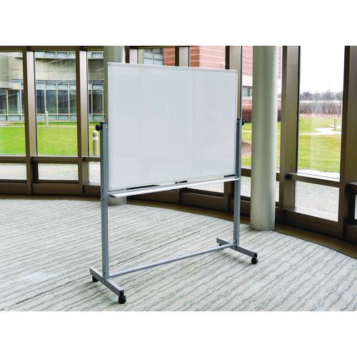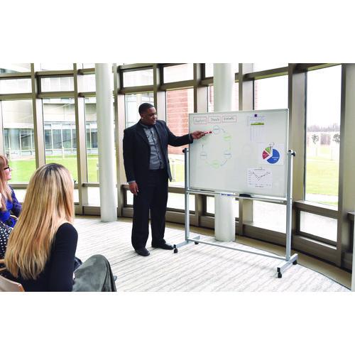 Built for brainstorming, teaching or organizing ideas and information, this Luxor mobile magnetic dry erase board doubles the writing space and delivers the durable mobility needed for dynamic workspaces. A slender-yet-sturdy frame provides a professional appearance and rolling casters make it easy move around a room. To flip the board, simply loosen the side knobs and disengage the spring-loaded locking clip. Need to display charts, papers or photos? Use the magnetic surface as a bulletin board. Look no further for a high-quality, affordable mobile marker board.