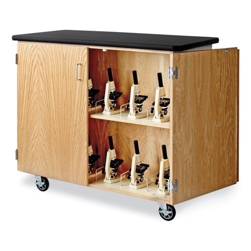 Provides a safe, convenient way to store microscopes. 1-1/4″ thick black plastic laminate top. Solid hardwood, solid oak and oak veneer cabinet with natural transparent finish. Unbreakable aluminum glides for both front and back sliding doors. Removable wire dividers provide individual, 6w x 9d x 16h, spaces for up to 24 standard classroom microscopes. 4″ ball-bearing swivel casters, locking. 48w x 24d x 40h.