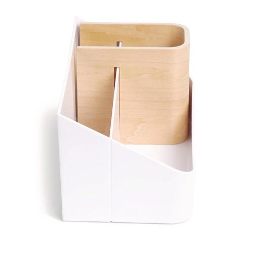 The Mod Bin All-In-One Desktop Organizer features everything needed for modern desktop organization. A sleek design with a touch of natural wood seamlessly complements any home décor style. Multiple compartments offer storage for letters, notes, and journals, and the bent wood cup compartment is perfect for pens, dry-erase markers and scissors. Personalize this organizer by sliding the adjustable real-wood cup from side to side.