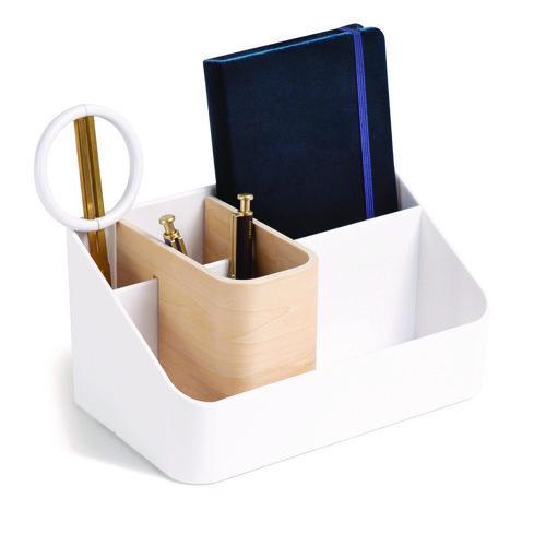 Mod All-in-One Desktop Organizer, 4 Compartments, 5.39 x 9.65 x 5.08, Plastic/Wood, White