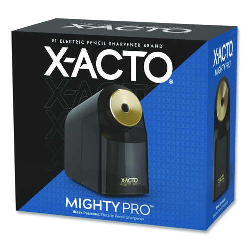 The fastest electric pencil sharpener from X-ACTO®, the Mighty Pro® sharpens woodcase pencils to a precise tip in no time. Break-resistant sharpening action ensures frustration-free operation. SmartStop prevents over-sharpening by automatically shutting off the motor when the pencil reaches ideal sharpness; and just to make sure, a bold LED lets you know when your pencil is ready to write. An auto-adjust dial seamlessly accommodates nearly any pencil size, while a slip-resistant bottom keeps the sharpener steady. SafeStart® electric motor locks the blades in place when the extra-large, easy-to-empty shavings bin is removed. Compatible with colored pencils. Stay sharp with X-ACTO®!