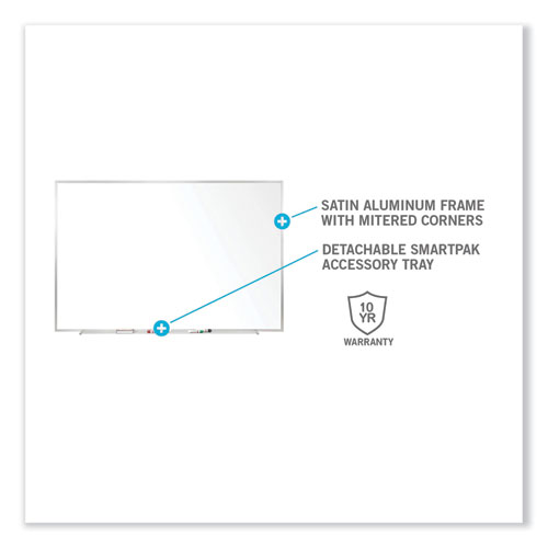 Product Details** Global Product Type Dry Erase Boards – Wall-Mount Board Surface Type(s) Dry Erase Magnetic Board Surface No Surface Material Melamine Surface Color White Dedicated Projection Screen No Flipchart Mounting System No Supports Custom Surface Formatting No Frame Material Aluminum Frame Color/Finish Satin Board Width 96.63″ Board Depth 0.63″ Board Height 48.47″ Preformatted Board Surface No Product Biodegradability Indicator N Product Biodegradability in Days 0 Product Compostability Indicator N Package Includes (1) Detachable SmartPak Accessories Tray,(1) Dry Erase Marker,(1) Board Eraser Pre-Consumer Recycled Content Percent 0% Post-Consumer Recycled Content Percent 0% Total Recycled Content Percent 0% Footnote 1 Surface Backing Details: 0.25″ Thick Hardboard Country Of Origin US Carton Weight 45 lbs. Carton Pack Quantity 1 EA Pack Quantity 0 UPC 014935002107 UNSPSC 44111905 Shipping Weight & Item Dimensions Weight 45 lbs. Length 96.63 in Height 48.47 in Width 0.63 in Warranty Manufacturer’s 10-year warranty.