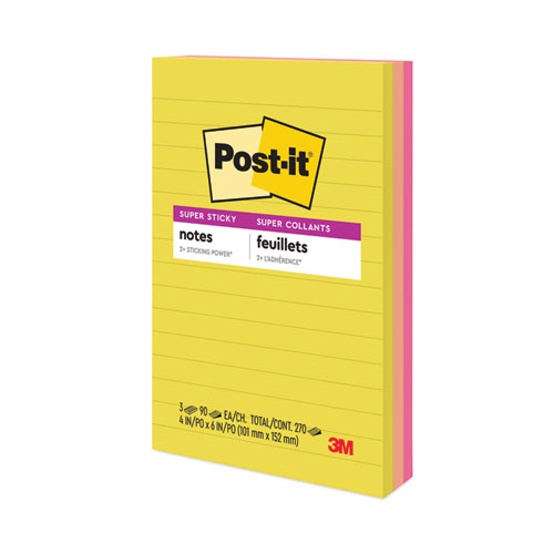 Product Details** Global Product Type Super-Sticky Pads Self-Stick Pad Type Super-Sticky Shape Rectangular Color Family Multicolor Ruling Note Ruled Sheet Size (W x H) 4″ x 6″ Color(s) Summer Joy Collection Color Assortment Citron,Papaya Fizz,Power Pink Number of Sheets per Pad 90 Product Biodegradability Indicator N Product Biodegradability in Days 0 Product Compostability Indicator N Pre-Consumer Recycled Content Percent 0% Post-Consumer Recycled Content Percent 0% Total Recycled Content Percent 0% Disclaimer Statement The specific Summer Joy Collection Colors included in this assortment may be randomly selected by the manufacturer when packaging the item. All possible colors may not be represented, and the item may not ship as shown. Country Of Origin US Carton Weight 10 lbs. Carton Pack Quantity 12 PK Pack Quantity 3 PD UPC 068060468970 UNSPSC 14111530 Shipping Weight & Item Dimensions Weight 0.77 lbs. Length 6 in Height 1.4 in Width 4 in