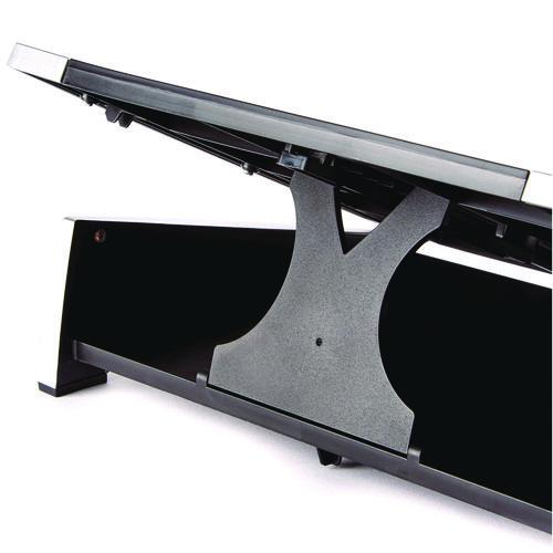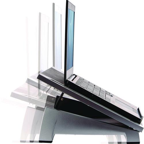 Fellowes Office Suites Laptop Riser features an adjustable tilt riser that provides the optimal keyboard level and viewing angle. Front bar holds laptop in place and keeps it from sliding forward. Durable plastic platform can support a 17″ laptop or up to 10 lbs. Perfect for use in the office, home office, or wherever you would like to raise your laptop to a convenient position.