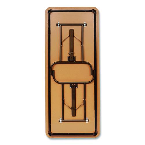 Wear-resistant, 3/4″ thick melamine top with vinyl T-mold edge. Melamine sealed underside helps prevent moisture absorption. Full perimeter steel skirt support with plastic corners to protect surface when stacking. 1″ diameter, heavy gauge steel legs with heavy-duty foot caps to protect floors. Heavy-duty leg supports and gravity leg lock for secure set-up. Folds to 2-1/2″ for compact storage.