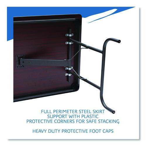 Wear-resistant, 3/4″ thick melamine top with vinyl T-mold edge. Melamine sealed underside helps prevent moisture absorption. Full perimeter steel skirt support with plastic corners to protect surface when stacking. 1″ diameter, heavy gauge steel legs with heavy-duty foot caps to protect floors. Heavy-duty leg supports and gravity leg lock for secure set-up. Folds to 2-1/2″ for compact storage.
