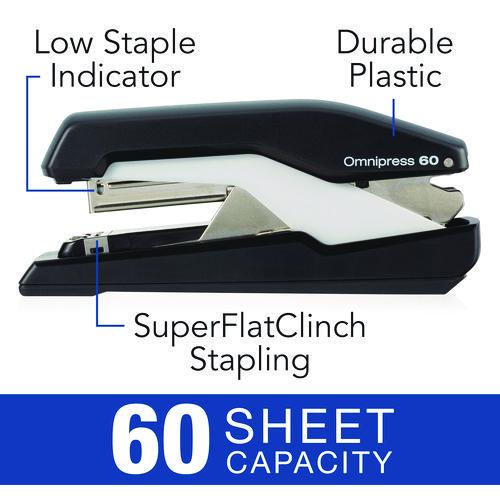 Press anywhere with less force! Unlike traditional staplers, patented Omnipress® technology lets you staple by pressing anywhere on the stapler body, and with patented SuperFlatClinch™ technology, paper stacks are up to 40% flatter. Compared to other press-less staplers, the Omnipress’s ergonomic design also provides superior in-hand or desktop use. Starter pack of staples is included.