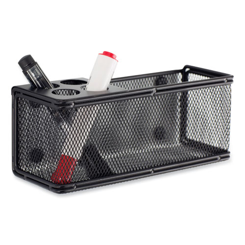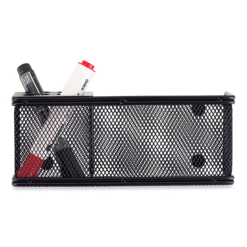 The Onyx™ Mesh Marker Organizer with Basket is a magnetic whiteboard accessory that allows easy storage of dry erase markers and erasers. It includes four stand-up marker holders that fit most standard whiteboard dry erase markers, making it easy to grab a marker when needed and helping to ensure markers are stored upside down so that they last longer. The magnetic back allows for use on whiteboards or any other magnetic surface, and features rare earth magnets that are strong enough to work on magnetic glass marker boards as well as standard magnetic whiteboards. The caddy also includes a basket that can hold erasers, markers or other supplies for easy access. In addition to its magnetic hold, this organizer has the option to be mounted to a wall with use of steel plate (included). The sturdy steel wire mesh construction of this caddy has a black powder-coated finish for scratch and chip resistance. It also includes rolled edges that are smooth to the touch and give a polished appearance. Great for use alongside whiteboards in classrooms, meeting spaces, training areas, conference rooms or offices.