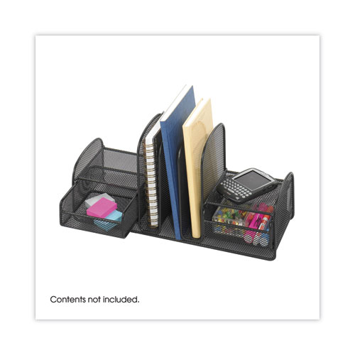 Maximize your desktop space with this smartly designed organizer that keeps everything neatly in place. Featuring three vertical sections that securely hold file folders and binders, it allows for easy access and organization. Two slide-out baskets are perfect for storing small desktop essentials like pens, paperclips or notepads. The sliding shelves offer an ideal solution for holding small electronics or accessories. Built with durable steel mesh construction, this organizer combines strength, functionality and a sleek, modern look to enhance any workspace. Stay organized and create a more efficient, clutter-free desk setup today!