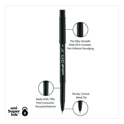Product Details** Global Product Type Rollerball Pens Pen Style Stick Pen Tip Type Conical Pen Point Size Type Fine Color Family Black Erasable Ink No Refillable No Pen Sub-Brand & Product Family ONYX® Pen Type Rollerball Pen Pen Point Size 0.7 mm Pen Ink Color(s) Black Pen Barrel Color(s) Black Pen Cap Color(s) Black Airplane-Safe Ink No Special Ink Properties Chemical-Dye Water-Based Ink Pen Grip Type Smooth Visible Ink Supply No Pocket Clip Indicator Yes Product Biodegradability Indicator N Product Biodegradability in Days 0 Product Compostability Indicator N Green Information Post-consumer recycled content sourced from recycled consumer electronics. Pre-Consumer Recycled Content Percent 0% Post-Consumer Recycled Content Percent 73% Total Recycled Content Percent 73% Country Of Origin JP Carton Weight 3 lbs. Carton Pack Quantity 12 DZ Pack Quantity 0 UPC 030246601433 UNSPSC 44121701 Shipping Weight & Item Dimensions Weight 0.222 lbs. Length 5.7 in Height 1.1 in Width 2.8 in