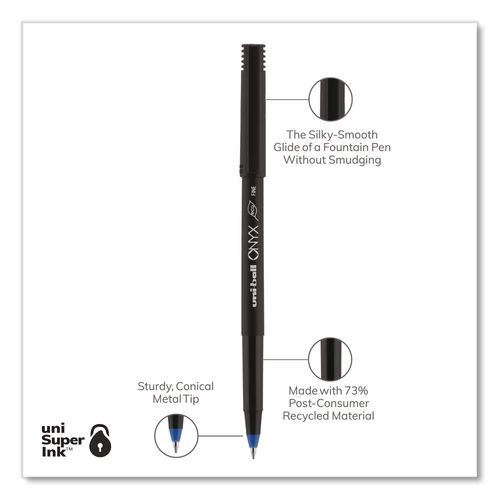 Stock your office, home or classroom with Onyx Rollerball Stick Pens from uni-ball featuring strong, long lasting tip sizes. This rollerball pen delivers the silky-smooth glide of a fountain pen without smudging for effortless writing. ONYX pens produce crisp and precise lines for intricate writing, making it easy to create super fine details in your drawings and diagrams. Capped roller pens are useful for a variety of tasks from note taking to signing checks and legal documents to uniquely embellishing fun and creative writing projects. Innovative uni Super Ink technology forms a strong bond with the paper, protecting from water, fading and fraud. A great economic and environmentally-conscious choice as this super sleek micro point roller pen is made from post-consumer recycled material.