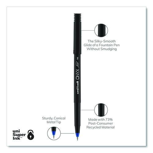 Product Details** Global Product Type Rollerball Pens Pen Style Stick Pen Tip Type Conical Pen Point Size Type Fine Color Family Blue Erasable Ink No Refillable No Pen Sub-Brand & Product Family ONYX® Pen Type Rollerball Pen Pen Point Size 0.7 mm Pen Ink Color(s) Blue Pen Barrel Color(s) Black/Blue Pen Cap Color(s) Black/Blue Airplane-Safe Ink No Special Ink Properties Chemical-Dye Water-Based Ink Pen Grip Type Smooth Visible Ink Supply No Pocket Clip Indicator Yes Product Biodegradability Indicator N Product Biodegradability in Days 0 Product Compostability Indicator N Green Information Post-consumer recycled content sourced from recycled consumer electronics. Pre-Consumer Recycled Content Percent 0% Post-Consumer Recycled Content Percent 73% Total Recycled Content Percent 73% Country Of Origin JP Carton Weight 3 lbs. Carton Pack Quantity 12 DZ Pack Quantity 0 UPC 030246601457 UNSPSC 44121701 Shipping Weight & Item Dimensions Weight 0.216 lbs. Length 5.7 in Height 1.1 in Width 2.8 in