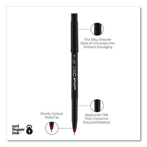 Product Details** Global Product Type Rollerball Pens Pen Style Stick Pen Tip Type Conical Pen Point Size Type Fine Color Family Red Erasable Ink No Refillable No Pen Sub-Brand & Product Family ONYX® Pen Type Rollerball Pen Pen Point Size 0.7 mm Pen Ink Color(s) Red Pen Barrel Color(s) Black/Red Pen Cap Color(s) Black/Red Airplane-Safe Ink No Special Ink Properties Chemical-Dye Water-Based Ink Pen Grip Type Smooth Visible Ink Supply No Pocket Clip Indicator Yes Product Biodegradability Indicator N Product Biodegradability in Days 0 Product Compostability Indicator N Green Information Post-consumer recycled content sourced from recycled consumer electronics. Pre-Consumer Recycled Content Percent 0% Post-Consumer Recycled Content Percent 73% Total Recycled Content Percent 73% Country Of Origin JP Carton Weight 3 lbs. Carton Pack Quantity 12 DZ Pack Quantity 0 UPC 030246601440 UNSPSC 44121701 Shipping Weight & Item Dimensions Weight 0.217 lbs. Length 5.7 in Height 1.1 in Width 2.8 in