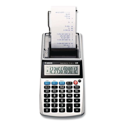 Palm printing calculator featuring a stylish silver metallic design. Advanced calculations right in the palm of your hand. Time calculation enables you to calculate time-based fee structures, while profit margin calculation can be calculated with the touch of a few keys. Tax rates can be stored and recalled whenever needed. Built-in battery indicator lets you know when it’s time to change the batteries.