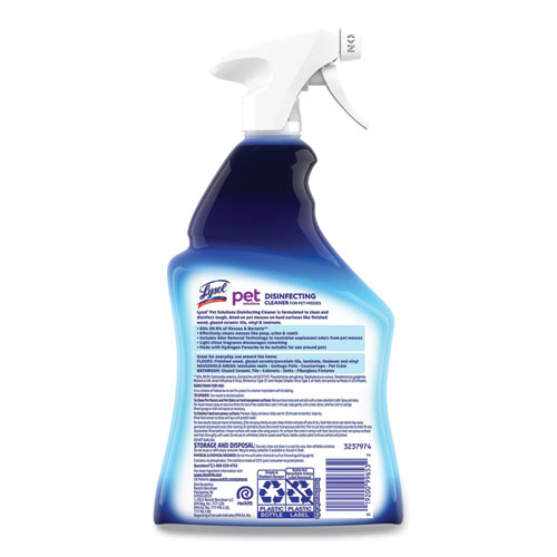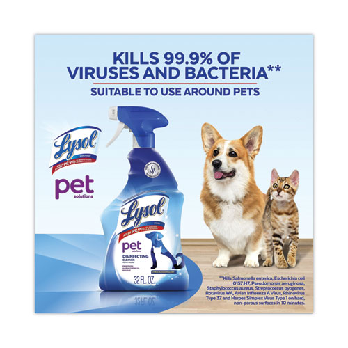 LYSOL Pet Solutions Disinfecting Cleaner is formulated to clean and disinfect tough, dried-on pet messes. Effectively cleans messes like poop, urine and vomit. Includes Odor Removal Technology to neutralize unpleasant odors from pet messes. Light citrus fragrance discourages remarking. Made with hydrogen peroxide to be suitable for use around pets.
