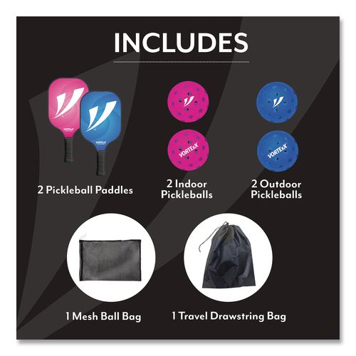 Product Details** Global Product Type Sports/Games Equipment Material(s) Composite Fiberglass,Polyethylene Length 15.75″ Width 7.75″ Diameter 2.9″ Playground/Gymnasium Sets Type Pickleball Product Biodegradability Indicator N Product Biodegradability in Days 0 Product Compostability Indicator N Package Includes (2) Outdoor Balls,(2) Indoor Balls,(2) Paddles,Mesh Ball Bag,Carry Bag Pre-Consumer Recycled Content Percent 0% Post-Consumer Recycled Content Percent 0% Total Recycled Content Percent 0% Special Features Pink and Blue Country Of Origin CH Carton Weight 14 lbs. Carton Pack Quantity 6 EA Pack Quantity 0 UPC 810123681303 UNSPSC 60141001 Shipping Weight & Item Dimensions Weight 2 lbs. Length 16.5 in Height 8.5 in Width 3.5 in