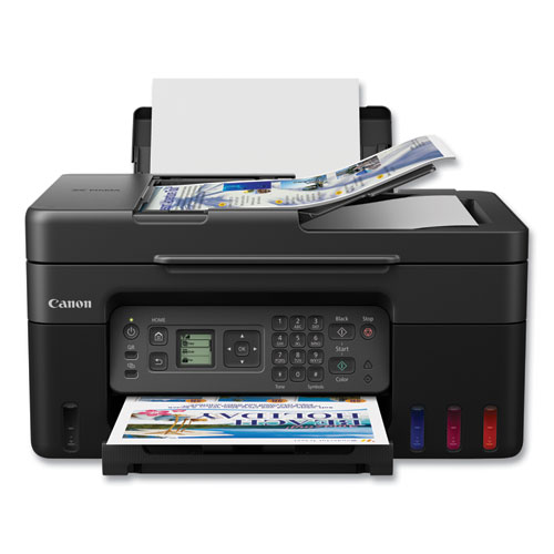 Designed for home offices, the Canon PIXMA G4270 MegaTank All-in-One inkjet printer delivers high-quality, low-cost printing, and outstanding wireless connectivity in a compact size. Get serious print productivity with a high page yield of up to 6,000 Black/7,700 Color pages per full ink bottle set and a low cost per print – MegaTank means Mega Savings. The PIXMA G4270 comes with a full set of ink, so you can print with confidence. The PIXMA G4270 is easy to set up and maintain and offers great media versatility to print on a variety of media types and sizes, including photo paper, envelopes, banners and more. Use Poster Artist Online to create professional-posters, banners and signage. Print both documents and photos on a variety of paper types using a hybrid ink system with pigment black for sharp black text and dye-based colors for vivid borderless photos up to 8.5” x 11”. Produce crisp, colorful documents quickly and cost-effectively with fast print speeds and a high-quality four-color pigment-based ink system. Keep printing with a plain paper capacity of up to 100 sheets or 20 photo sheets (4” x 6”). Easily connect and print through high-speed USB or wirelessly from computers or mobile devices.