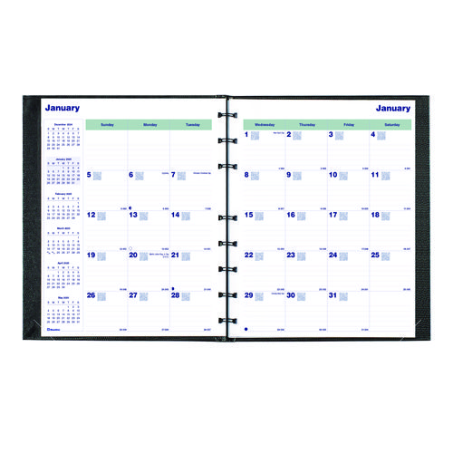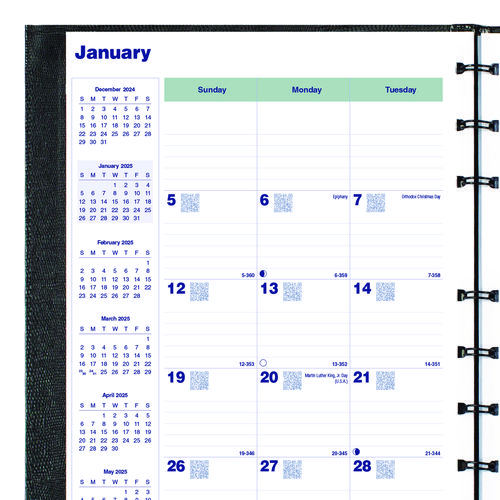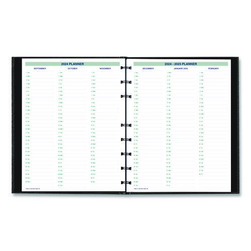 Product Details** Global Product Type Appointment Book/Personal Organizers Dated Yes Academic Year No Calendar Format Monthly Edition Year 2024 to 2025 Calendar Term 16-Month (Sept to Dec) Binding Type Wire-O Color Family Black Refillable No Calendar Spread Format One Month per Two-Page Spread Julian Dates Yes Size (Bound-Side First) 9.25 x 7.25 Binding Details Twin-Wire: Flexible Cover Cover Color(s) Black Cover Material(s) Faux Leather Binding Color(s) Black Calendar Reference Blocks One Past Month,Current Month,Four Future Months Separate Sections Financial Interest Table,Ruled Notes Pages,Standard/Metric Conversion Tables,Telephone & Address Pages,Two-Year Day-Date Reference Sheet Color(s) White Reversible No Seasonal Availability Yes Product Biodegradability Indicator N Product Biodegradability in Days 0 Product Compostability Indicator N Pre-Consumer Recycled Content Percent 0% Post-Consumer Recycled Content Percent 50% Total Recycled Content Percent 50% Disclaimer Statement This product was made using wood sourced from a certified managed forest. Special Features Lizard-Like Faux Leather Cover Country Of Origin CA Carton Weight 14 lbs. Carton Pack Quantity 20 EA Pack Quantity 0 UPC 069775696559 UNSPSC 44112004 Shipping Weight & Item Dimensions Weight 0.65 lbs. Length 9.25 in Height 0.188 in Width 7.25 in