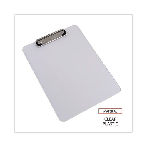 Product Details** Global Product Type Standard Clipboards Holds Paper Size 8.5 x 11 Clip Capacity 0.5″ Color(s) Clear Number of Compartments 0 Clipboard Actual Size 9 x 12.5 Clipboard Material Plastic Product Biodegradability Indicator N Product Biodegradability in Days 0 Product Compostability Indicator N Pre-Consumer Recycled Content Percent 0% Post-Consumer Recycled Content Percent 0% Total Recycled Content Percent 0% Country Of Origin CN Carton Weight 11 lbs. Carton Pack Quantity 24 EA Pack Quantity 0 UPC 087547403105 UNSPSC 44122012 Shipping Weight & Item Dimensions Weight 0.43 lbs. Length 12.4 in Height 0.5 in Width 8.84 in Warranty Manufacturer’s limited one-year warranty.
