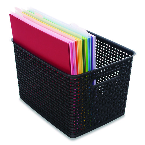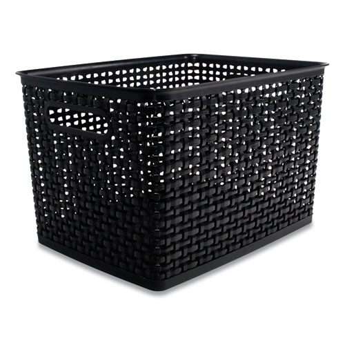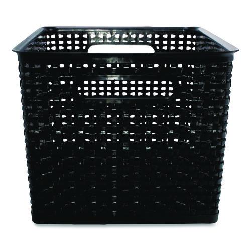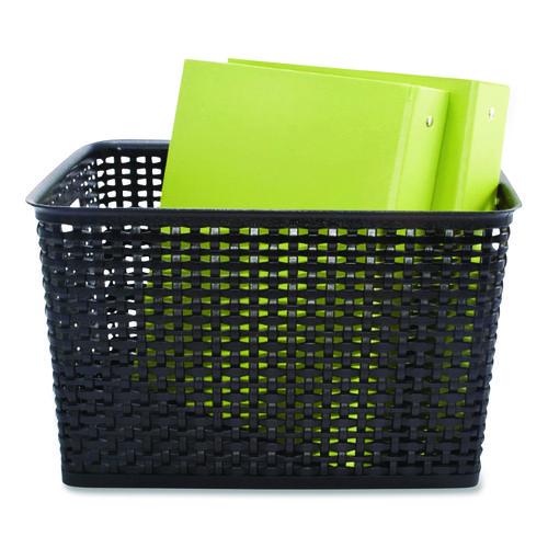 The perfect storage solution and balance of function and fashion, the plastic weave bin declutters any home or office environment. Constructed of sturdy black plastic, this bin can store pretty much anything. The classic black color will blend into any room.