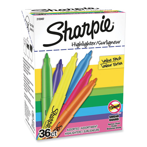 Product Details** Global Product Type Stick Highlighters Highlighter Style Pen Color Family Multicolor Highlighter Tip Type Chisel Highlighters Erasable Ink No Retractable No Pocket Clip Indicator Yes Highlighter Ink Color Assorted Highlighter Ink Color Assortment (8) Yellow,(6) Blue,(6) Green,(6) Orange,(6) Pink,(4) Purple Highlighter Barrel Color Assorted Highlighter Barrel Color Assortment (8) Yellow,(6) Blue,(6) Green,(6) Orange,(6) Pink,(4) Purple Grip Type Smooth Product Biodegradability Indicator N Product Biodegradability in Days 0 Product Compostability Indicator N Compliance Standards ACMI AP Non-Toxic Certified Pre-Consumer Recycled Content Percent 0% Post-Consumer Recycled Content Percent 0% Total Recycled Content Percent 0% Country Of Origin US Carton Weight 5 lbs. Carton Pack Quantity 6 PK Pack Quantity 36 EA UPC 071641188853 UNSPSC 44121716 Shipping Weight & Item Dimensions Weight 0.83 lbs. Length 5 in Height 2.875 in Width 4.187 in