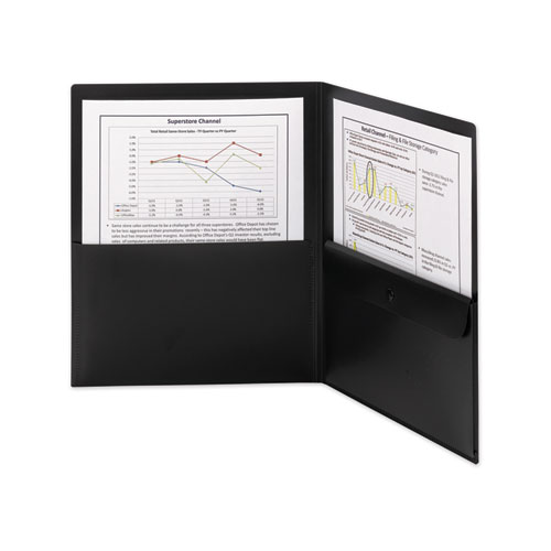 Product Details** Global Product Type Two Pocket Folders Sheet Size 11 x 8.5 Color Family Black Brad/Prong/Tang Fasteners No Design Snap-Closure Security Pocket (9 x 5) Front Cover Color(s) Black Back Cover Color(s) Black Pocket Folders Capacity (text) 100 Sheets Inside Pockets One Back,One Front Cover Material(s) Polypropylene Product Biodegradability in Days 0 Green Information Acid free, PVC free. Pre-Consumer Recycled Content Percent 0% Post-Consumer Recycled Content Percent 0% Total Recycled Content Percent 0% Footnote 1 Snap-closure security pocket measures 9 x 5 Country Of Origin CN Carton Weight 10 lbs. Carton Pack Quantity 10 PK Pack Quantity 5 EA UPC 086486877008 UNSPSC 44122011 Shipping Weight & Item Dimensions Weight 0.99 lbs. Length 11.63 in Height 1.5 in Width 9.63 in