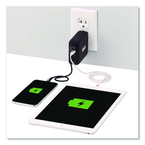 Combination wall charger and mobile power bank charges smartphones, tablets and other mobile devices either with or without an AC outlet. Plugs into wall outlet to charge up to two devices and itself at the same time. Ideal for road trips, hikes, blackouts and other applications without AC power. USB-A and USB-C ports provide up to 5 V 2.4 A (AC) or 5 V 3 A (DC) for charging. 5,000 mAh of lithium-ion battery capacity is plenty for hours of maximum power draw. LED indicators show remaining power bank battery capacity at a glance.