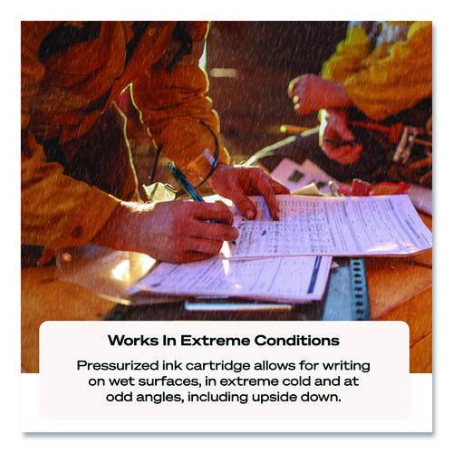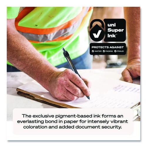 Write effectively in the toughest conditions with Power Tank Retractable Ballpoint Pens from uni-ball featuring a 1.0 mm medium point. Designed to perform optimally in extreme conditions, the pens feature a pressurized ink cartridge that offers fast and clean writing even on damp surfaces, in bitterly cold conditions or at unusual angles, including upside down. The refillable ballpoint pens come with a textured rubber grip that encourages greater writing comfort. uni Super Ink™ has pigmented particles that create an indelible bond with the paper, helping you create fraud, fade and water resistant documents even in harsh environments. The 1.0v mm medium point offers bold strokes with a rich color payoff for clear writing. When you need a rugged writing tool, this refillable ballpoint click pen is the best choice in any hemisphere.