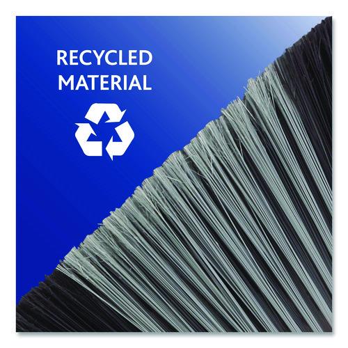 Cleaning combs on step-on dust pan remove 3x more hair for hands-free cleaning. Dual-bristle technology with firm black bristles that pull dirt from corners and semi-soft bristles that capture and move dirt effectively. Large broom head covers more surface area. Dust pan lip seals to the floor for easy, hands-free debris pickup. Dust pan anti-static technology releases dirt into trash with one tap. Made from recycled plastic.