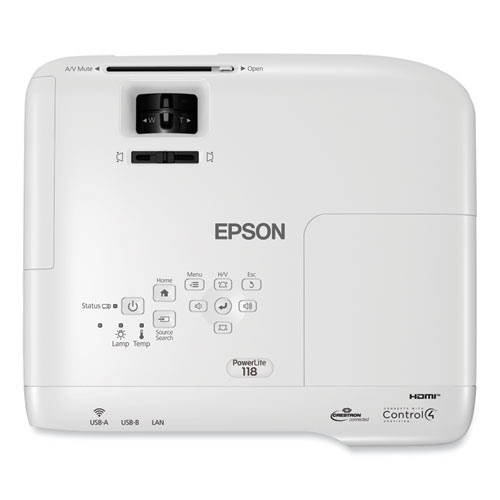 Enrich lesson plans with the ultra bright PowerLite® 118 projector. Built with advanced 3LCD technology, this dynamic XGA projector displays vibrant images with 3,800 lumens of color and white brightness. Featuring an integrated Moderator function, the PowerLite® 118 allows up to 50 users to connect to the display and share content from laptops or mobile devices. A durable and reliable solution, it features a long lamp life up to 17,000 hours, a 16W speaker, a microphone input, and dual HDMI ports to support versatile and engaging projection in a variety of learning environments.