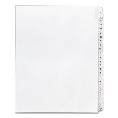 Product Details** Global Product Type Printed Exhibit Numeric Index Dividers Index Divider Style Legal Arabic Numeric Tab Orientation Side Tab Tab Style 25-Tab Color Family White Punched/Unpunched Unpunched Index Divider Size 11 x 8.5 For Use With Comb Binding Systems Index Divider Material(s) Heavyweight Ledger Paper Index Divider Color(s) White Tab Material(s) Heavyweight Ledger Paper Tab Color(s) White Legal Tab Style Allstate Style Tab Title(s) 26 to 50 Tab Title Color(s) Black Index Divider Form Quantity 1 Set Product Biodegradability Indicator N Product Biodegradability in Days 0 Product Compostability Indicator N Green Information PVC-free. Pre-Consumer Recycled Content Percent 0% Post-Consumer Recycled Content Percent 0% Total Recycled Content Percent 0% Special Features Collated, 11 x 8.5, Side Tab Country Of Origin MX Carton Weight 9 lbs. Carton Pack Quantity 20 ST Pack Quantity 25 EA UPC 072782017026 UNSPSC 44122010 Shipping Weight & Item Dimensions Weight 0.415 lbs. Length 11 in Height 0.3 in Width 9 in