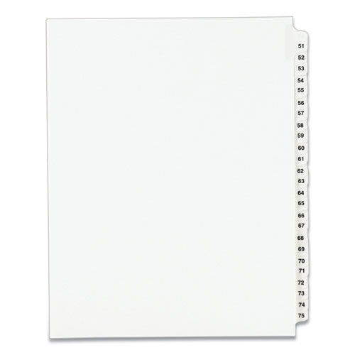 Product Details** Global Product Type Printed Exhibit Numeric Index Dividers Index Divider Style Legal Arabic Numeric Tab Orientation Side Tab Tab Style 25-Tab Color Family White Punched/Unpunched Unpunched Index Divider Size 11 x 8.5 For Use With Comb Binding Systems Index Divider Material(s) Heavyweight Ledger Paper Index Divider Color(s) White Tab Material(s) Heavyweight Ledger Paper Tab Color(s) White Legal Tab Style Avery Style Tab Title(s) 51 to 75 Tab Title Color(s) Black Index Divider Form Quantity 1 Set Product Biodegradability Indicator N Product Biodegradability in Days 0 Product Compostability Indicator N Green Information PVC-free. Pre-Consumer Recycled Content Percent 0% Post-Consumer Recycled Content Percent 0% Total Recycled Content Percent 0% Special Features Collated, 11 x 8.5, Side Tab Country Of Origin MX Carton Weight 9 lbs. Carton Pack Quantity 20 ST Pack Quantity 25 EA UPC 072782013325 UNSPSC 44122008 Shipping Weight & Item Dimensions Weight 0.414 lbs. Length 11 in Height 0.3 in Width 9 in