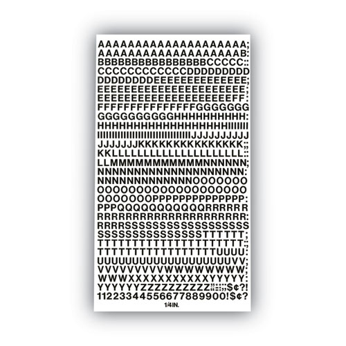 Product Details** Global Product Type Adhesive Characters Character Types Letters,Math/Money Symbols,Numbers,Punctuation/Language Symbols Character Mounting Type Self-Adhesive Color Family Black Material Type Plastic Character Style Helvetica Uppercase Number of Pieces 610 Character Color Black Material(s) Vinyl Height 0.25″ Product Biodegradability Indicator N Product Biodegradability in Days 0 Product Compostability Indicator N Pre-Consumer Recycled Content Percent 0% Post-Consumer Recycled Content Percent 0% Total Recycled Content Percent 0% Special Features Self-Adhesive Numbers and Uppercase Letters Country Of Origin US Carton Weight 2 lbs. Carton Pack Quantity 12 PK Pack Quantity 610 EA UPC 014173118493 UNSPSC 55121721 Shipping Weight & Item Dimensions Weight 0.042 lbs. Length 12.5 in Height 0.1 in Width 6 in