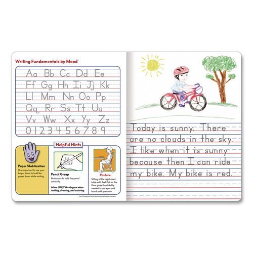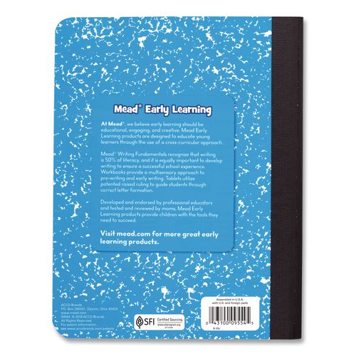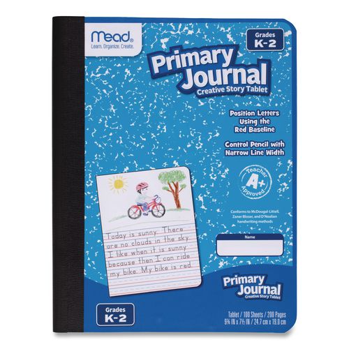 Mead Primary Journal lets young students learn and create, with plenty of space for writing, and room for their pretty pictures! Journal is appropriate for grades K-2. Double-sided primary ruling is printed with solid and dotted lines. Ideal for beginning students who want to improve their handwriting. Top half of each page is blank for illustrating stories. Blue marble cover includes manuscript alphabet for reference. Sewn binding keeps pages in place and lays flat on any surface.