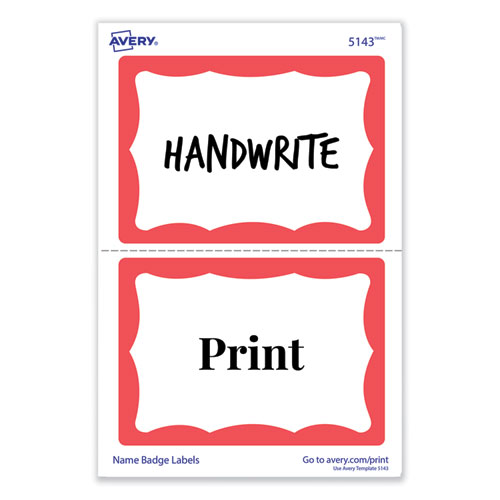 Product Details** Global Product Type Self-Adhesive Name Tags Orientation Horizontal Name Badge Label Material(s) Paper Name Badge Label Color(s) White/Red Machine Compatibility Inkjet Printers,Laser Printers Name Badge Label Length 2.33″ Name Badge Label Width 3.38″ Sheets Per Unit 50 Name Badges Per Sheet 2 Name Badges per Unit 100 Sheet Length 6″ Sheet Width 4″ Product Biodegradability in Days 0 Pre-Consumer Recycled Content Percent 0% Post-Consumer Recycled Content Percent 0% Total Recycled Content Percent 0% Disclaimer Statement Not recommended for use on corduroy, plastic, leather, silk, suede, velvet, vinyl or other delicate fabrics. Special Features Border-Style Country Of Origin MX Carton Weight 5 lbs. Carton Pack Quantity 18 PK Pack Quantity 100 EA UPC 072782051433 UNSPSC 55121503 Shipping Weight & Item Dimensions Weight 0.346 lbs. Length 7.7 in Height 0.5 in Width 4.7 in