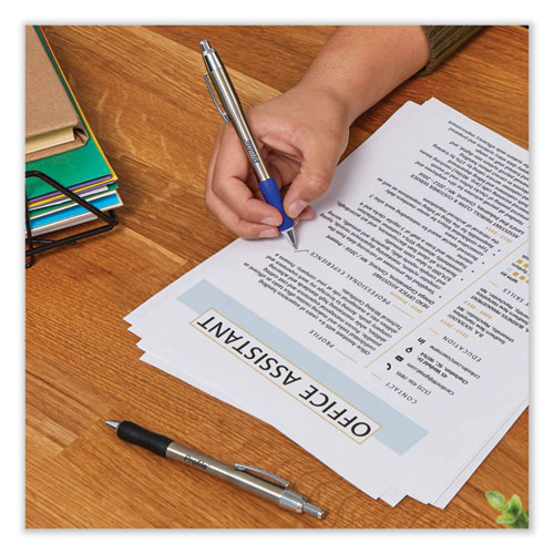 Product Details** Global Product Type Ballpoint Pens Pen Style Retractable Pen Tip Type Conical Pen Point Size Type Medium Color Family Blue Erasable Ink No Refillable No Pen Sub-Brand & Product Family Profile Pen Type Ballpoint Pen Pen Point Size 1 mm Pen Ink Color(s) Blue Pen Barrel Color(s) Blue/Silver Airplane-Safe Ink Yes Low-Viscosity Ink No Pen Grip Type Contoured Rubber Visible Ink Supply No Pocket Clip Indicator Yes Product Biodegradability in Days 0 Pre-Consumer Recycled Content Percent 0% Post-Consumer Recycled Content Percent 0% Total Recycled Content Percent 0% Country Of Origin IN Carton Weight 5 lbs. Carton Pack Quantity 48 PK Pack Quantity 2 EA UPC 071641188945 UNSPSC 44121704 Shipping Weight & Item Dimensions Weight 0.118 lbs. Length 0.7 in Height 2.9 in Width 7.65 in