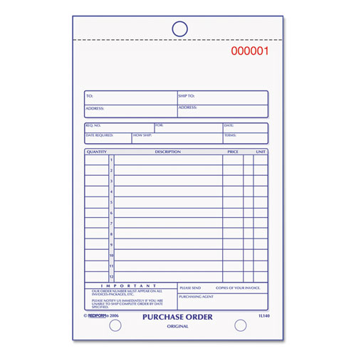 Product Details** Global Product Type Sales & Work Order Forms Form Type Details Invoice/Receipt Dated No Forms Per Page 1 Format Indicator Pad Copy Types Two-Part Carbonless Color Family White Form Size 5.5 x 7.88 Form Binding Stapled,Taped Punching Bottom: Two-Hole Forms per Pad/Book 50 Form Quantity (Total) 50 Principal Heading(s) Purchase Order Number of Entry Lines 12 Paper Color(s) White Copy Paper Color(s) Yellow Print and Ruling Color(s) Blue Numbering Preprinted Top (Original),Write-In Top (Copy) Numbering Color(s) Blue,Red Product Biodegradability Indicator N Product Biodegradability in Days 0 Product Compostability Indicator N Pre-Consumer Recycled Content Percent 0% Post-Consumer Recycled Content Percent 0% Total Recycled Content Percent 0% Special Features 12 Lines Country Of Origin CA Carton Weight 24 lbs. Carton Pack Quantity 50 EA Pack Quantity 0 UPC 077925011404 UNSPSC 14111811 Shipping Weight & Item Dimensions Weight 0.432 lbs. Length 8.5 in Height 0.4 in Width 5.5 in