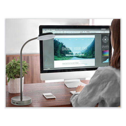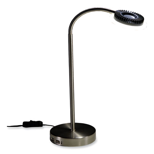 They say that two is better than one. That’s why this USB desk lamp features two integrated USB ports for ultimate device charging, making this a two-in-one product! Bring the outdoors in and give your eyes a break! Its full-spectrum lighting mimics natural daylight, perfect for long, busy days in the office where you are unable to take a break. Effortlessly fitting into any personal or work environment due to the compact design, this USB desk lamp introduces convenience and style. The sand-polished nickel finish and acrylic accents give this 8-watt desk lamp a sleek, professional look. The gooseneck design allows for simple positioning for light. The circle lamp head provides flicker-free light zones that steer clear of shadows and halos. Save money and use cost-efficient LEDs that require 85% less energy than incandescent lamps! How can it get better than this?